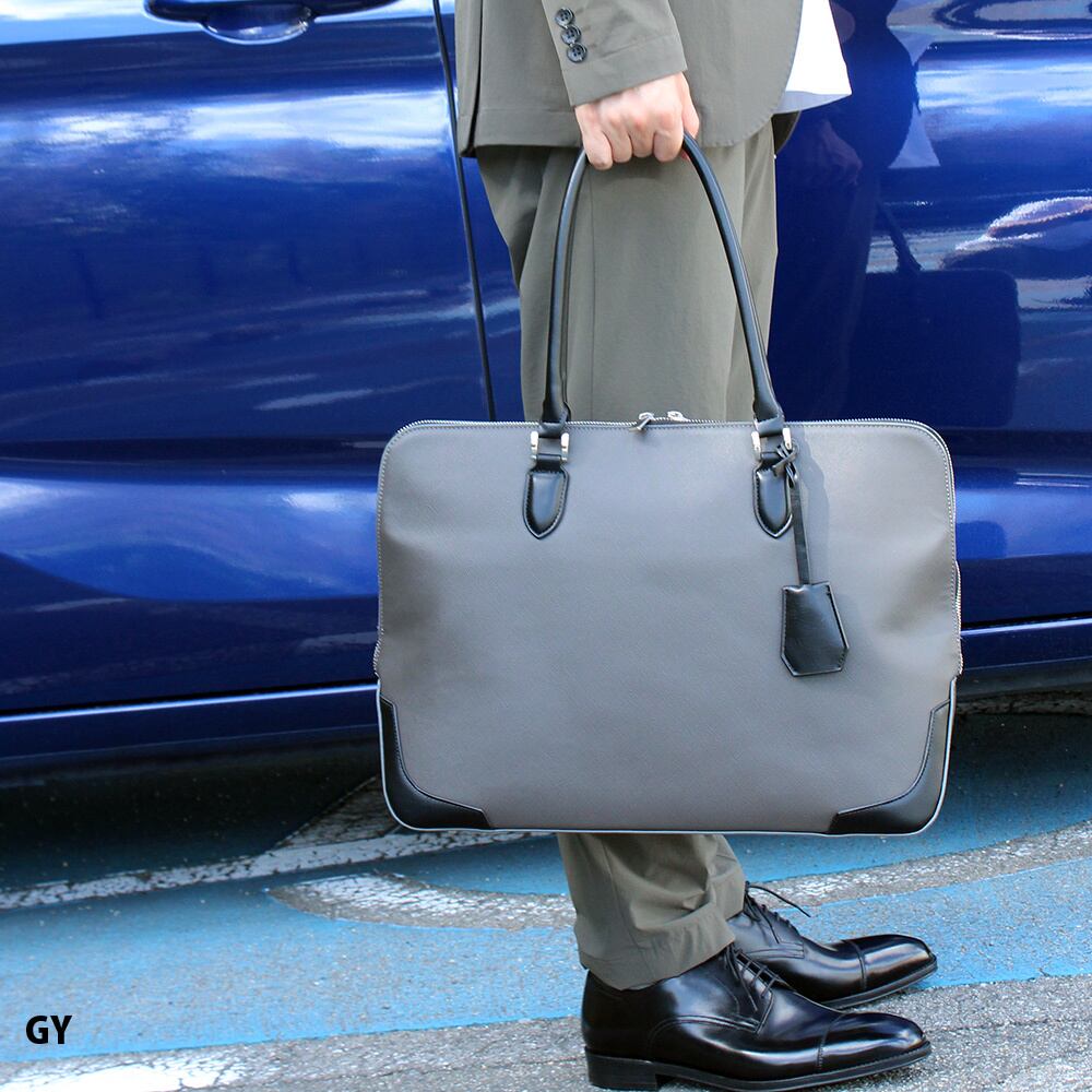 上品な細かいシボが魅力のサフィアーノ合皮をメイン素材に使用したブリーフトートです。傷や汚れ、水に強く、美しい質感を長くキープできるのが特長。フラットな合皮とのコンビネーションがアクセントとなり、持ち手は丸手仕様で快適な持ち心地です。