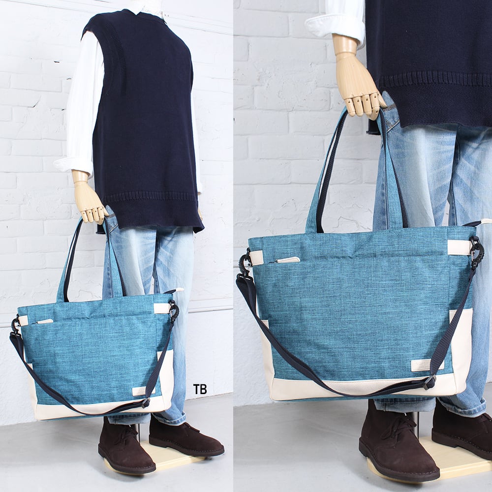 撥水性のある軽量杢ポリエステルと高級感のあるPU素材を組み合わせ、内装ポケットも充実。