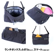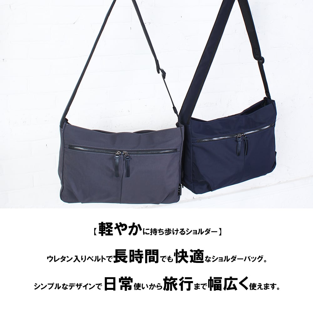 正面のマチ付きファスナーポケットで荷物の出し入れがしやすく、ウレタン入りショルダーベルトは長時間の使用でも快適です。