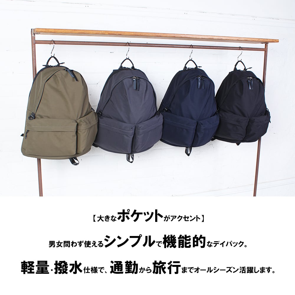 正面の大きなポケットがデザインのアクセントになり、収納力も十分。
