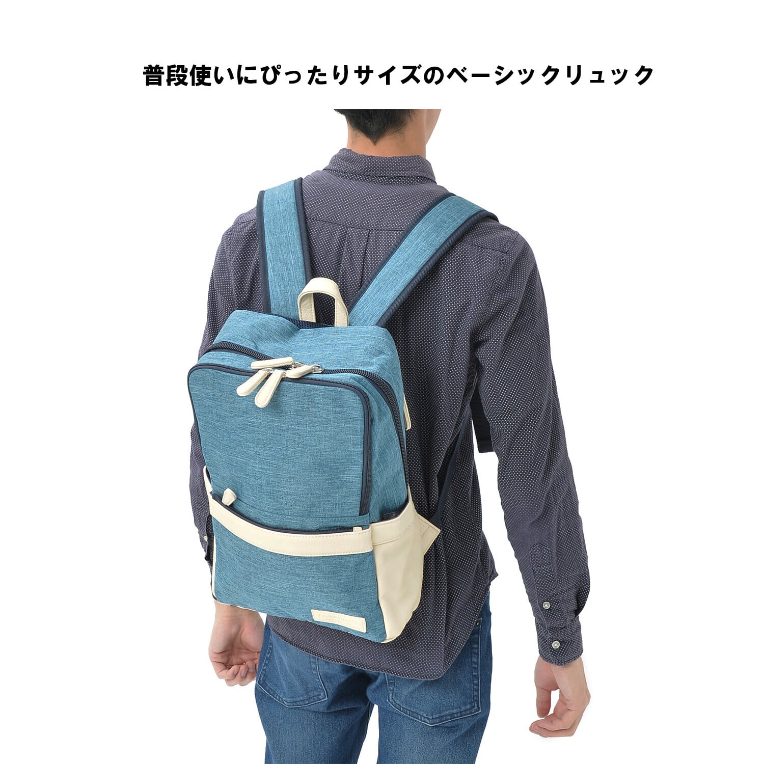 装いを選ばないスクエア型多機能リュックです。 本体素材は杢調ポリエステル/はっ水加工Xシボ合皮の落ち着いた雰囲気です。 収納力抜群で本体前側にファスナーポケット、両サイドには折傘など収納に便利なベタポケットがあります。 整理しやすい2ルームタイプで前側は内装に二分割ベタポケットがあります。 その後側ルームの内装の背面にPC収納ポケット、前側に二分割ベタポケットがあります。 A4ジャストサイズで男性はもちろん。女性にもピッタリです。
