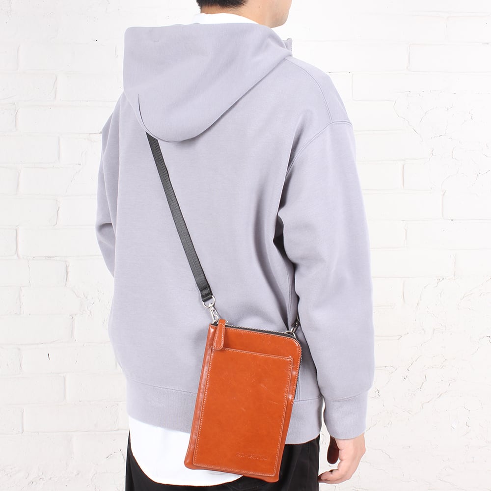 このスマートミニショルダーバッグは、オイルレザー風PUレザーを使用しているため、高級感がありながらも柔らかくしなやかな肌触りが特徴的です。光沢があり、上品でクールな印象を与えます。前面にある大きなオープンポケットが特徴的なデザインで、裏側にも名刺や定期などカード類を入れられる便利で機能的な仕様になっていますショルダー紐は取り外しの出来る仕様になっているのでクラッチバッグ風に使っていただく事も出来ます。オン・オフ問わずご利用いただける汎用性も備えています。