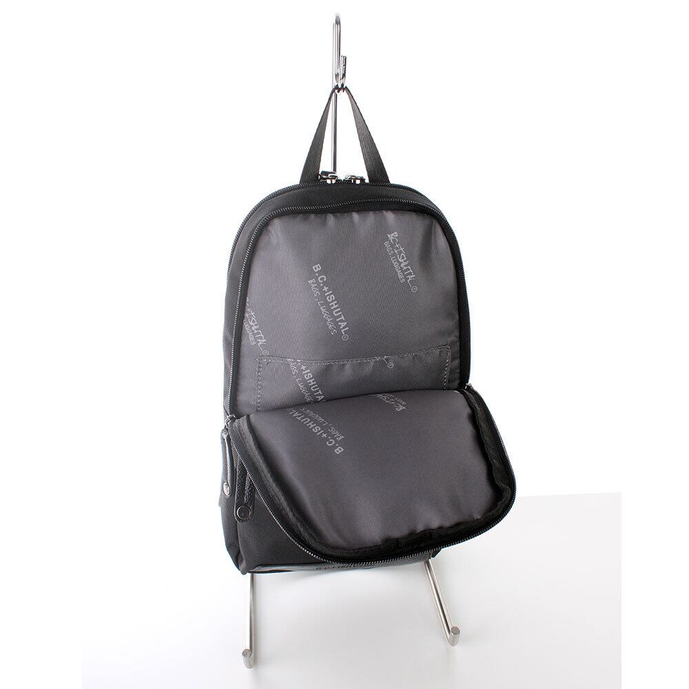 ボディバッグ上部の前側ポケットの内装にはオープンポケットが1個ついており、スマホなどを入れて取り出しやすくなっています。前面にもファスナーポケットがついているので、小物類などの収納が楽ちんです。メイン収納部には、前側にオープンポケットが1個、後ろ側にウレタンポケットが1個搭載されており、様々な用途でご利用いただけます。背面はメッシュ仕様になっているため、ムレなどを軽減してくれます。また、背面にはファスナーポケットも搭載されているため、小銭入れやICカードなどを入れて便利にご利用いただけます。