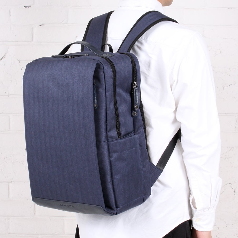 このヘリンボンデイリーリュックは、モダンなヘリンボン柄とスクエアシルエットが特徴的な、しっかりとしたデザインです。中身が空っぽでも一杯でも、形が崩れないため、小旅行や長旅にも最適です。裏面にはメッシュのパッド付きのストラップがあり、チェストベルトも付属しているため、身体に合わせて長さを調節することができます。