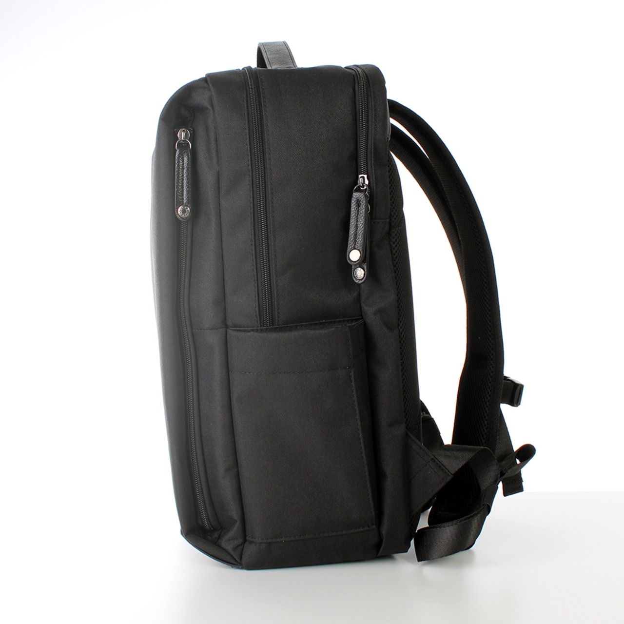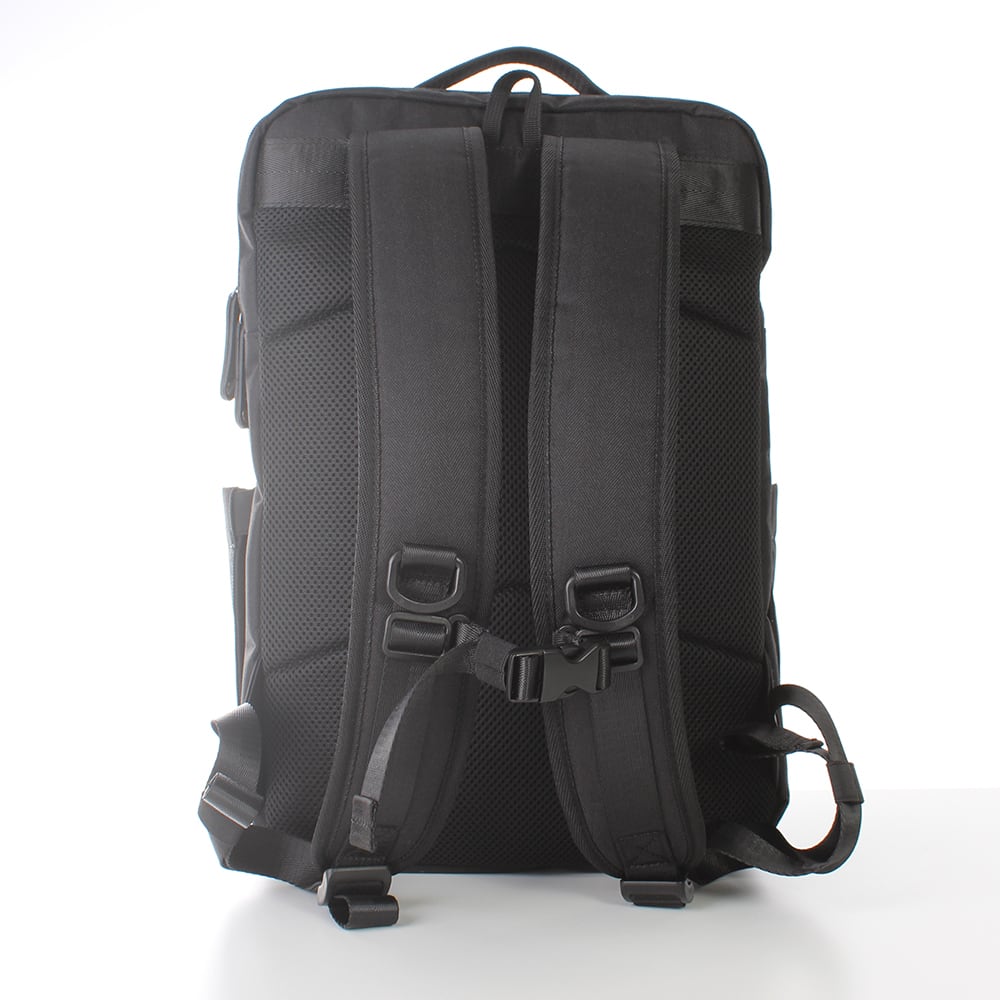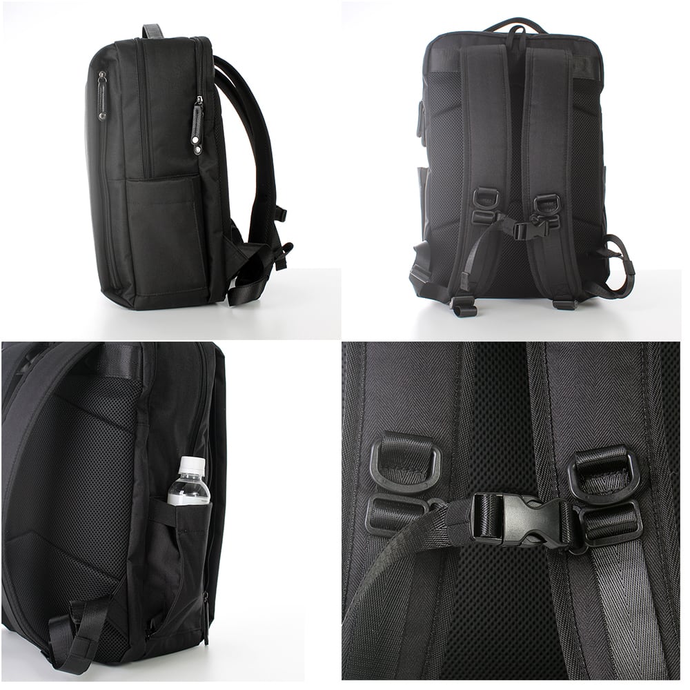 このデイリーリュックのメインスペースは容量15リッター収納可能で、日々の必需品がほぼすべて収納可能です。整理整頓しやすいポケットがたくさんついているため、効率よく荷造りでき、バッグの中身を常にスッキリ収納された状態に保てます。13.3インチのノートパソコンとb4ノートが入るため、持ち運ぶときに傷がつく心配もありません。また、タブレットやスマートフォンなどの電子機器を入れることもできます。さらに、便利な収縮するゴム付サイドポケットがついているため、どこにいても自由に水分補給ができます。雨の日に折りたたみ傘を入れることも可能です。本体素材は撥水も効いているので雨の日でも安心。デザインもミニマルで使いやすく、オン・オフ問わずにご利用いただけます。