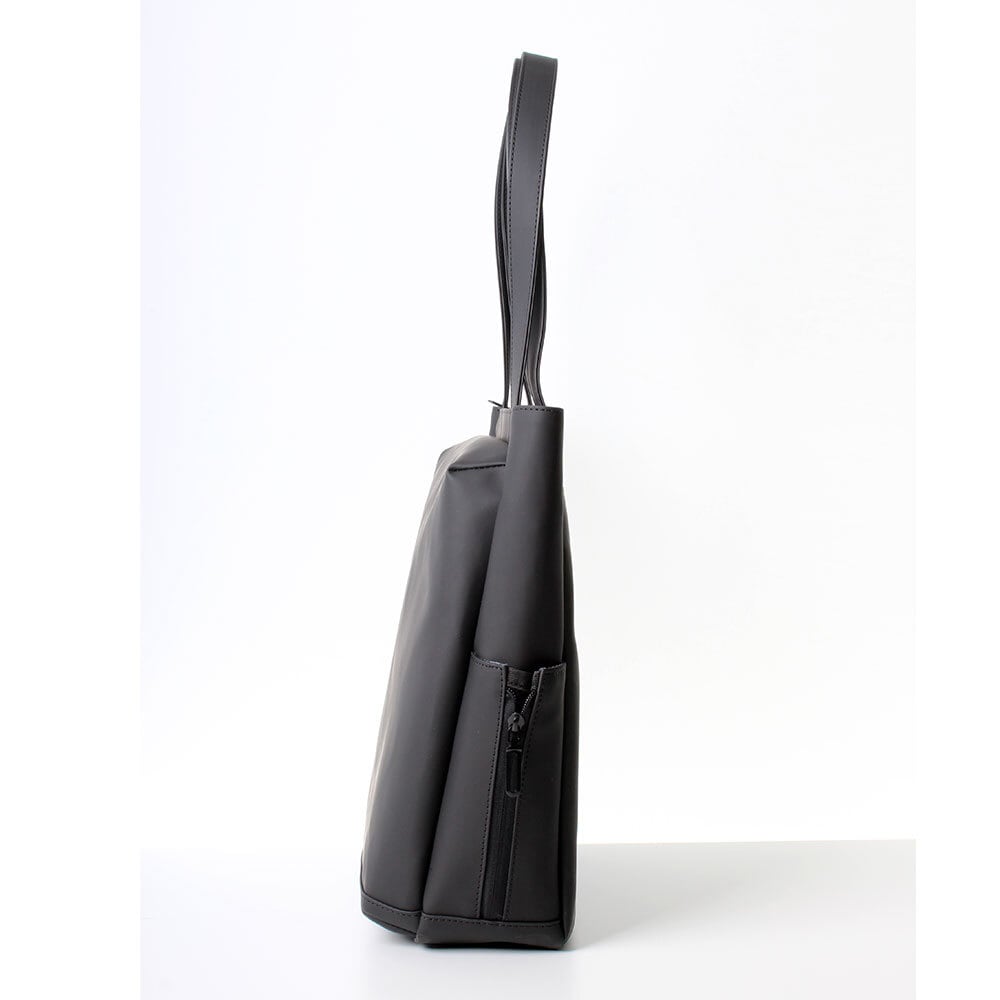 素材は固すぎず柔らかすぎない丁度良い素材感に加えて、表面は水に強いPUコーティング素材で艶の無いマッドな質感で高級感があります。引手は黒メッキのスタイリッシュな金属引手で見た目の印象をグレードアップしてくれています。正面の大き目のポケットはサイドにファスナー口があり持ちながらでも出し入れが簡単です。サイド片側にはファスナーポケットが付いているので拡張して、折り畳み傘などを収納することも出来ます。背面にはポケット口にマグネットホックボタンの付いたポケットがあり、書類やタブレット類などを簡易的に保存しておくのに便利です。内装にはウレタンポケット×1、オープンポケット×2、ファスナーポケット×1など充実しており、整理整頓も楽々です。ビジネスシーンでも気軽にカジュアルにも使える汎用性のあるスマートトートバッグです。